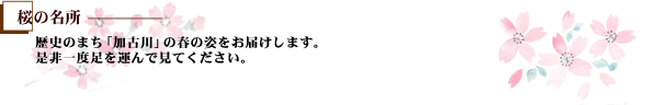 加古川市を代表する総合公園として、子供からお年寄りまで親しまれているこの公園は、桜の名所としても大変有名です。35.8haの広大な敷地に、約1,500本の桜が咲き誇り、多くの見物客でにぎわいます。夜には約300本のボンボリが点灯され(3月下旬〜5月上旬)、夜桜見物も楽しめます。総合運動公園、野球場、1,200人収容の体育館、50mプールやファミリープールを完備した数々の現代施設もあります。 ←写真をクリックすると拡大写真が見られます。