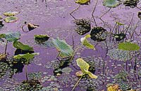 ▲ 池の周辺部には、ハスやヒシ、ガガブタなどのさまざまな水生植物が見られる。(大池)